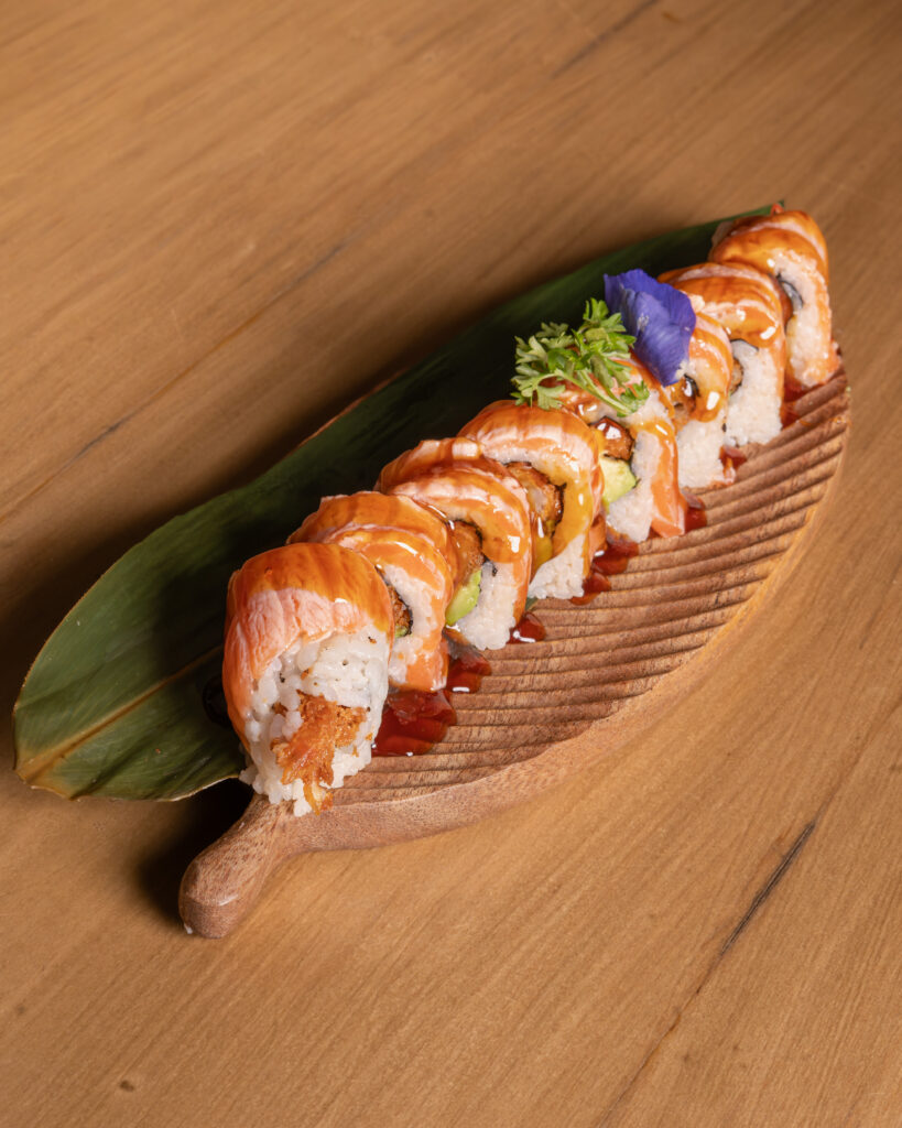 Interno gambero* fritto in farina di riso e maionese spicy. Sopra salmone scottato, salsa teriyaki